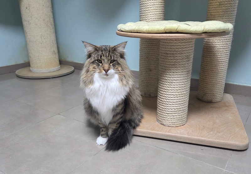 Stratos V.Moenus viene desde Alemania para ser un buen macho de cría. Después de una larga búsqueda, te elegimos a ti por varios motivos, uno de ellos porque tiene de ancestro a Melissa Skogkatt Norsk de mi línea antigua junto a Eryn Galen que tiene unos fantásticos gatos. Otro motivo es que viene de línea Esbjerg's como nuestro gran macho O'malley, que nos ha dado muy buen resultado. Él es la perfecta combinación pafra nuestra casa, un gato muy grande y fuerte con el mejor perfil que he visto, tiene el morro largo lo que va a venir bien para las hembras de línea más antigua. Las orejas las tiene muy bien colocadas y como podeis ver una bonita expresión. Estamos muy contentos de haberle encontrado, su carácter es increíblemente bueno y se lleva fenomenal con el resto del grupo.